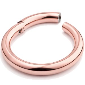 316L surgical stainless steel smooth segment ring with hinge mechanism, finished in PVD rose gold. The hinge on this ring makes it easier to fit than standard segment rings (with fully removable segments) because you won't drop the segment. This ring features a hinge on one side of the segment and a tiny stem on the opposite side. When the segment is opened, the ring can be inserted into the piercing. To open the segment, gently pull the two ends of the ring apart and the segment will drop down to one side. To replace the segment, gently pull the two ends of the ring apart, position the small stem into the hole (both on the opposite side of the ring to the hinge) and then release your hold. The two ends of the ring will squeeze together to hold the segment in place. This hinged segment ring has a gauge of 5mm and is offered in a choice of internal diameter sizes between 12mm and 22mm.