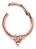 High quality 316L surgical stainless steel segment ring finished in PVD rose gold, with a gauge of 1.2mm. This hinged segment ring features a cluster of pretty crystal gems which are front-facing. The hinge on this ring makes it easier to fit than standard segment rings (with fully removable segments) because you won't drop the segment. This ring features a hinge on one side of the segment and a tiny stem on the opposite side. When the segment is opened, the ring can be inserted into the piercing. To open the segment, gently pull the two ends of the ring apart and the segment will drop down to one side. To replace the segment, gently pull the two ends of the ring apart, position the small stem into the hole (both on the opposite side of the ring to the hinge) and then release your hold. The two ends of the ring will squeeze together to hold the segment in place. This hinged segment ring is available in a choice of internal diameter sizes between 8mm and 10mm.