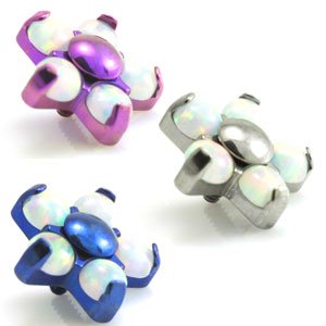 Highly-polished internally-threaded titanium labret featuring a screw-in opal flower. The flower features a protruding threaded stem which screws into a hole at the end of the labret stem. The outer gauge of the main labret stem is 1.2mm which makes it suitable for 1.2mm gauge piercings. (The threading on the inside of the main labret stem is 0.9mm, which is the same as the threading on the stem protruding from the flower.)This 1.2mm gauge internally-threaded titanium labret is offered in a choice of lengths between 4mm and 18mm. The flower measures 6.5mm in diameter and features five synthetic opal gems. The metal surrounding the flower is offered in a choice of titanium colours - however, please note that the main labret stem colour is always mirror polish; it is only the metal on the flower which is offered in a choice of colours.