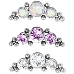 Highly-polished internally-threaded titanium labret featuring a beautiful array of three round jewels. The sparkly curved jewelled setting features a protruding threaded stem at the back, which screws into the hole at the end of the labret stem. The outer gauge of the main labret stem is 1.2mm which makes it suitable for 1.2mm gauge piercings. (The threading on the inside of the main labret stem is 0.9mm, which is the same as the threading on the stem protruding from the jewel.)The straight 1.2mm gauge titanium labret stem is offered in a choice of lengths between 4mm and 18mm. The jewelled setting measures 13mm wide - this comprises a 4mm diameter gem in the centre, with 3mm diameter gems on either side. The ten decorative titanium balls each measure 1.3mm in diameter.