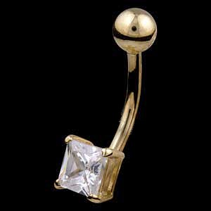 Genuine 9 carat gold belly bar. This expertly-crafted, solid 9ct gold belly bar features a beautiful 5mm x 5mm square crystal clear gem which is held securely in place by gold clasps. The exquisite design is perfectly complemented by a solid 9 carat gold, 5mm diameter, screw-on top ball. Alternatively, you can select a 4mm or 5mm diameter top ball featuring a clear crystal gem for a small additional cost. The gauge of this belly bar is 1.6mm and the stem is offered in a choice of lengths between 5mm and 10mm. All of our 9ct gold belly bars come with the option of a free Satin Ivory Textured Gift Box. If you would like to receive one, simply select 'Yes please' in the box above.