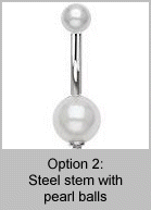 Fun and festive Christmas snowman suspended beneath a 1.6mm gauge curved belly bar. The shiny snowman measures 14mm x 20mm and is manufactured from highly polished rhodium plate. This belly bar is offered in a wide choice of stem sizes between 6mm and 24mm. There are five options for you to choose from regarding the stem and the balls (see illustrations) - you can select either a 316L surgical stainless steel, titanium or soft and flexible bioflex stem. You can also choose either steel or pearl effect balls to complete your look. Please note that sizes 20mm to 24mm are only available with a bioflex stem.