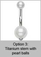 Shiny steel elephant decoration suspended beneath a 1.6mm gauge curved belly bar. The elephant, which is dotted with sparkly crystal jewels, measures 22mm x 14mm and is 6mm thick and the jewels are offered in a choice of colours. The belly bar is offered in a wide choice of stem sizes between 6mm and 24mm. There are five options for you to choose from regarding the stem and the balls (see illustrations) - you can select either a 316L surgical stainless steel, titanium or soft and flexible bioflex stem. You can also choose either steel or pearl effect balls to complete your look. Please note that sizes 20mm to 24mm are only available with a bioflex stem.
