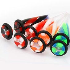 UV acrylic fake stretcher on a 1.2mm gauge x 6mm threaded steel barbell. The widest end of the stretcher gives the impression that you're wearing an 8mm gauge expander. The 6mm barbell is easily changeable with one of your own preferred lengths of barbell simply by unscrewing. The overall length of this fake stretcher is approximately 50mm and it is available in a choice of colours.